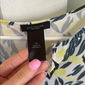 This Ann Taylor blouse features a relaxed fit with a graphic design that adds a touch of artistic flair. The cream color serves as a versatile base, complemented by 3/4 sleeves for a comfortable and stylish look. Perfect for casual outings or a day at the office, this top combines elegance with a modern twist.