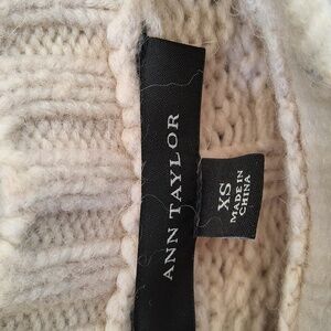 Ann Taylor sweater, cream colored, long sleeves, size XS, cable knit sweater, 19% merino wool, 18% alpaca wool, great condition, approx 21 inches in total length