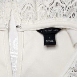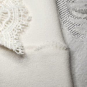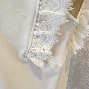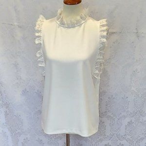 Flirty fun top that can be dressed up with a nice pair of slacks, or toss on with your jeans!  Love the versatility and uniqueness of this top with a lace neckline and shoulders. Hook and eye closure at back of neck with key hole opening. Polyester/Spandex blend. Wash in cold, dry on low.  Washed and never worn. There is a small area where the stitching has come loose close to armpit. I don't know how that happened, since it's never been worn. The stitching on the inside is still in tact so there isn't a hole. Discounted to reflect flaw.