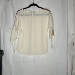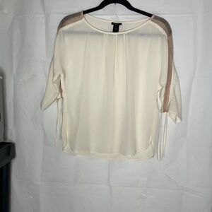 This elegant cream blouse by Ann Taylor features a sophisticated pleated design near the neckline, offering a touch of refinement. Crafted from a lightweight, flowy fabric, it ensures comfort and style for any occasion.