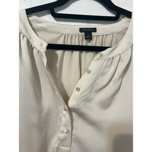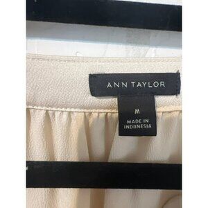 Elevate your style with the Ann Taylor Cream Blouse in size M. This chic top features covered buttons and stylish balloon printed sleeves for a touch of sophistication.