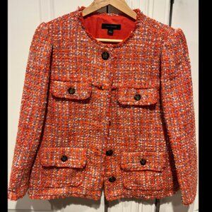 Super cute! Cropped tweed jacket in orange/ multicolor. Five buttons down middle, 4 real front pockets, 3/4 sleeves. Lined