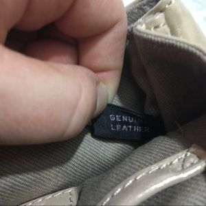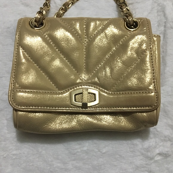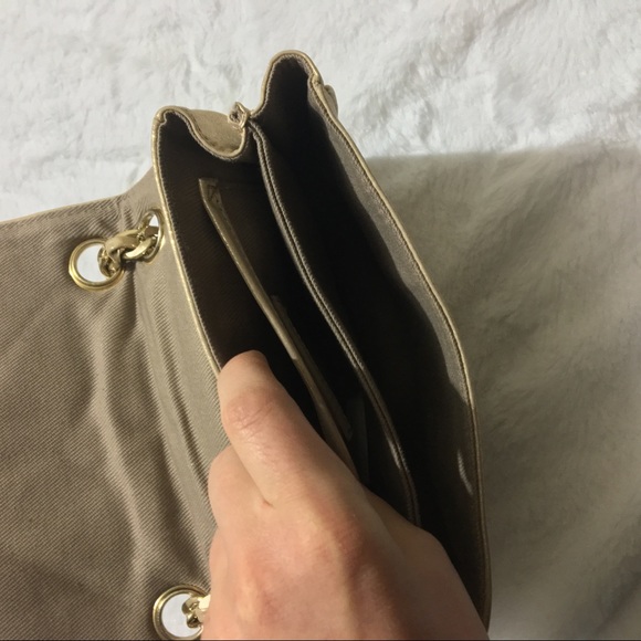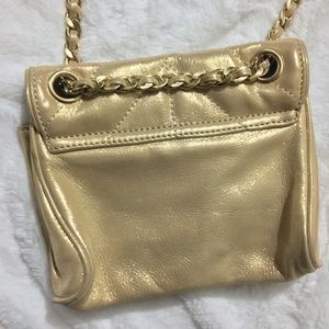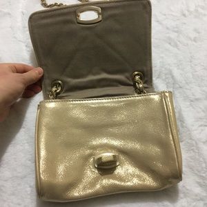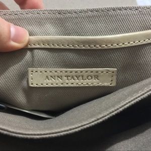 Ann Taylor Crossbody Chain Purse. Color is light gold. Has a chain-and-leather shoulder strap and turn lock closure. It also has 2 big pockets on the inside and 1 smaller pocket with a zipper.Made out of Genuine Leather. Has TINY speck on the back(see picture.) No other damages.