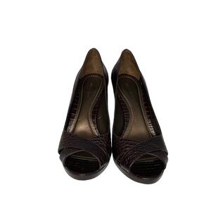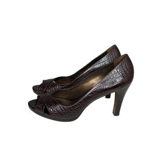 Ann Taylor 3.5” heel dark brown croc pattern. Peep toe pump. Mark on inner sole rt shoe in pic. GUC worn just a few times. Size 9M