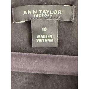 The Ann Taylor Factory dress is a stylish and versatile option for women looking for a sophisticated yet comfortable outfit for work or a professional setting. This black sleeveless dress features a flattering sheath style with a knee-length hem, making it suitable for various occasions. Made from a blend of polyester, spandex, and cotton, it boasts a stretch feature for added comfort and flexibility. The dress is designed with a zipper closure for easy wear and showcases a classic and preppy aesthetic, perfect for a dark academia or business-ready look.