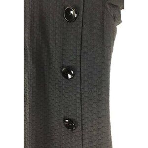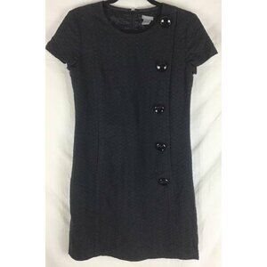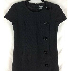 A women's size small dress from Ann Taylor. The dress is in solid black with a textured weave pattern. The dress is lined, shift style, classic, round neckline, short sleeves, buttons, pockets, knee length and is in excellent pre-owned condition.