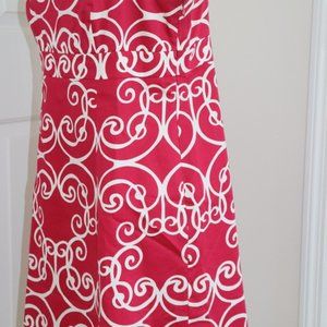 Ann Taylor pink & white geometric scroll cotton spaghetti strap A-line, flared dress. Empire style with hidden side zipper. Fully lined, lightweight dress. Perfect worn alone, with a wrap of with the shrug sweater shown INCLUDED. From a clan, smoke-free home.