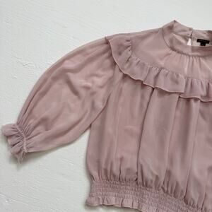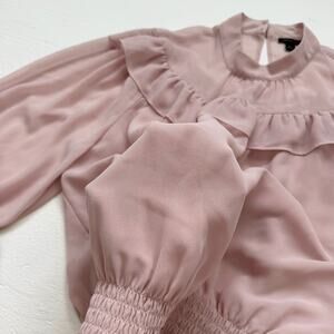 this ann taylor blouse is crafted from lightweight chiffon in a soft dusty pink shade. designed with ruffle detailing, a smocked hem, and sheer long sleeves, it’s perfect for workwear, special occasions, or an elevated casual look. double lined for coverage while keeping its flowy and feminine silhouette.