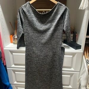 This sophisticated gray sheath dress by Ann Taylor features an asymmetrical neckline and 3/4 sleeves, making it perfect for work or cocktail occasions. The elegant design is complemented by a stylish draping effect, adding a touch of modern flair to your wardrobe.