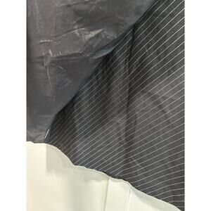 Black pin stripe. Fully lined. 65/28/4/3 cotton/nylon/spandex/other blend. Inner button and outer tie.
