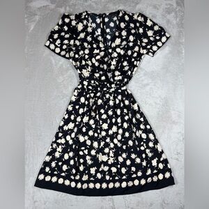 Ann Taylor Factory Black Cream Floral A line Short Sleeve Surplice Dress Size 2