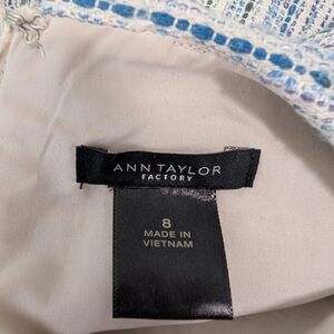 This elegant Ann Taylor Factory dress features a sophisticated blue and white tweed pattern with a modern silhouette. Perfect for the office or special occasions!