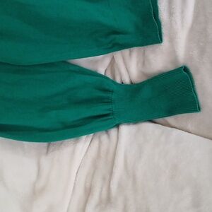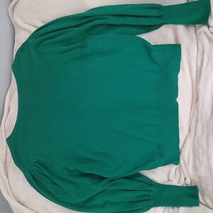 Elegant emerald knit top with ribbed neckline and a puffed sleeve. Ideal for the holiday season. No visible flaws nor stains. Excellent condition.