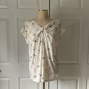 Ann Taylor Factory Ivory Floral Top V-Neck Knot Keyhole Front - L Large