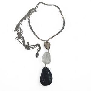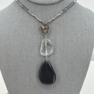 Focal pendant features a smoky cabochon, a clear faceted bead, and a smooth deep blue goldstone focal