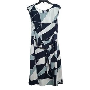 Description: Ann Taylor Factory Navy Geometric Print Sleeveless Dress, size 14, NWT. Features 100% polyester, sleeveless design with a sophisticated navy, light blue, and gray abstract angular pattern, round neckline, knee-length cut, waist belt tieable in front or back, perfect for various occasions. Smoke-free home, fast shipping, bundle to save!