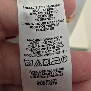 Off white base fabric with repeating pattern of small floral sprigs in two color variations: red and orange. This dress is one piece with an illusion of two separates.