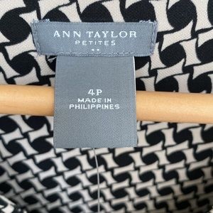 Ann Taylor Factory Petites sleeveless V-neck dress. Features a black and cream geometric print with a fitted bodice and slightly flared skirt for a flattering A-line silhouette. Perfect for work, dinner, or any polished occasion.
