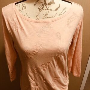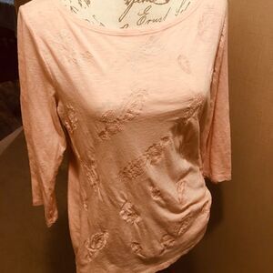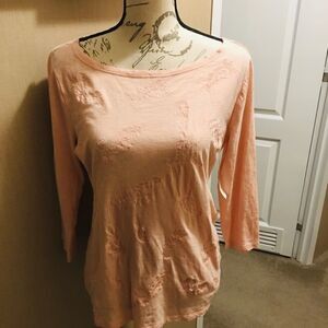 Ann Taylor Factory pink long sleeve blouse with a pretty embroidered design on the front.