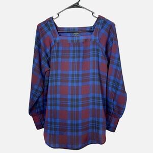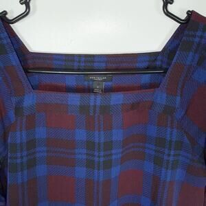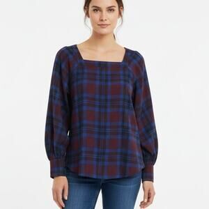 Ann Taylor Factory Plaid Blouse Women’s S Burgundy Blue Long Sleeve Square Neck