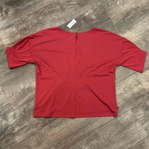 Elegant red top with ruched detailing. Short sleeves. Perfect for any occasion.