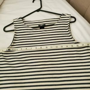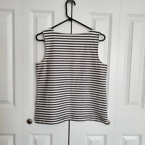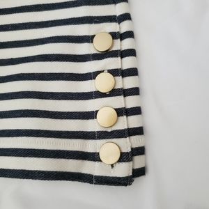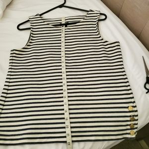 Ann Taylor Factory Stretchy Shell Top. Cotton. #492152 Navy and Off White. 4 workable gold tone buttons on left side. See pictures for measurements. very good condition. Medium Petite size.Loc: C1