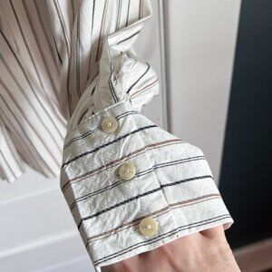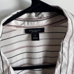 Comfortable, silky, flowy button down from Ann Taylor Factory. It's got three-button cuffs and slight gathering at the shoulders, which gives it a feminine silhouette. Simple stripes and a creamy off-white color for versatility!