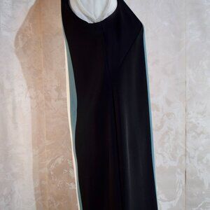 This is a versatile, sleeveless shift dress featuring bold vertical color-blocking in black, white, teal blue, and bright orange/coral panels. It has a classic crew neckline in the front and likely a concealed back zipper closure. The material is a smooth polyester. This dress works equally well for a business casual office setting or weekend wear.