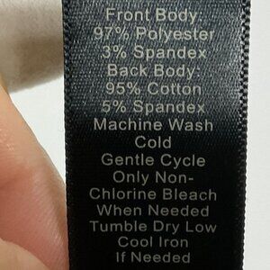 The front of the top feels satin-like (97% poly, 3% spandex) while the back is a knit (95% cotton, 5% spandex).