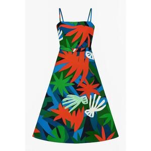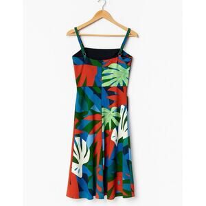 Ann Taylor Factory sleeveless sundress featuring a bold tropical leaf print in red, green, blue, black, and white. Fit & flare silhouette with adjustable spaghetti straps and back zip closure. Lightweight and perfect for vacations, summer parties, or resort wear. Size 2.