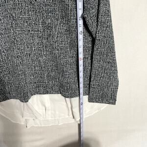 This Ann Taylor Factory sweater offers the perfect layered look without the bulk. The top portion is a soft tweed-like knit in shades of gray, black, and white, while the bottom and collar are a lightweight, crisp white fabric. The V-neckline and faux layered shirt design give it a polished, professional feel that's suitable for the office or a casual outing. The high-low hemline adds a modern touch.