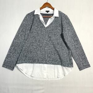 This Ann Taylor Factory sweater offers the perfect layered look without the bulk. The top portion is a soft tweed-like knit in shades of gray, black, and white, while the bottom and collar are a lightweight, crisp white fabric. The V-neckline and faux layered shirt design give it a polished, professional feel that's suitable for the office or a casual outing. The high-low hemline adds a modern touch.