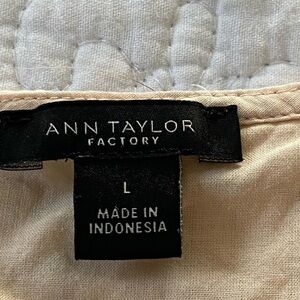 This relaxed blouse from Ann Taylor Factory features a yellow beige color with elegant pleating, eyelet lace, fully lined and wide elbow sleeves, offering a sophisticated yet comfortable style. The flowing boxy silhouette makes it perfect for both casual and semi-formal occasions. In excellent preowned condition with no flaws.