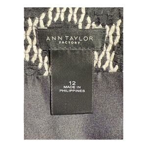 Keywords: Ann Taylor Factory, knee-length skirt, pencil skirt, black skirt, geometric pattern, knit fabric, business wear, casual wear, women's fashion, size 12, straight fit, versatile skirt.