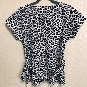 Ann Taylor Factory black knit top snow Leopard print blouse with a belt size SP