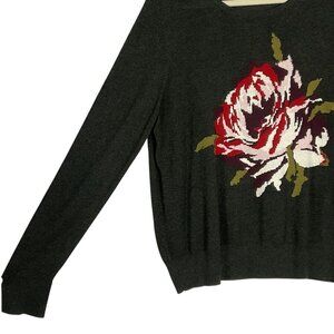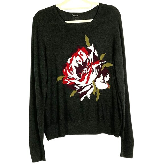 Ann Taylor Factory long-sleeve pullover sweater in dark gray featuring a prominent floral intarsia design in red, white, pink, green