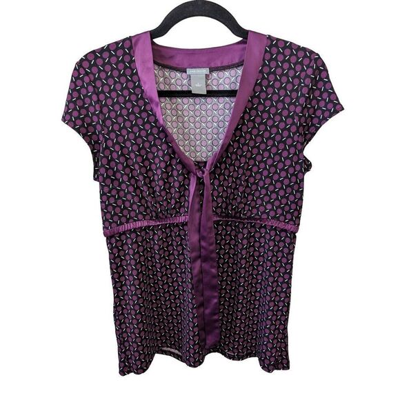 Ann Taylor Factory Women’s Black Purple Short Sleeve with Bow Tie Blouse