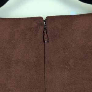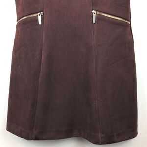 Ann Taylor Faux Suede Sleeveless Dress with Gold Zipper Pockets in Brown. This classic dress features 2 asymmetrical pockets in the front with gold zippers, hidden back zipper with a hook & eye closure, and front & back shaping seams for a feminine fit. Super soft faux suede with a bit of stretch. Size 14P.