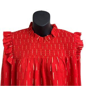 Ann Taylor Festive Red Shimmer Clip Smocked Ruffle Blouse