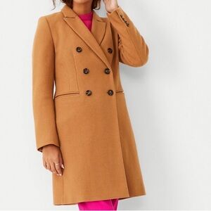 This classic double-breasted coat by Ann Taylor is a perfect edition to your fall wardrobe. It features double breasted button front, peaked lapel, and faux besom front pockets. Wool blend. It measures 20 inches from armpit to armpit and the length is 36 inches.
