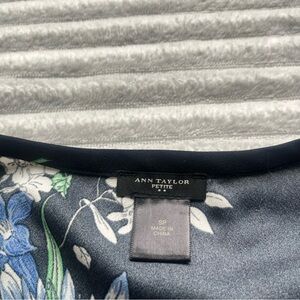 Ann Taylor brand sleeveless blouse. Black with green, blue, and white floral pattern. Scoop neck. Has thread pulls, see photos for details. Notch sides. Cute knit detail around the bottom. Lightweight material, great for warm weather.