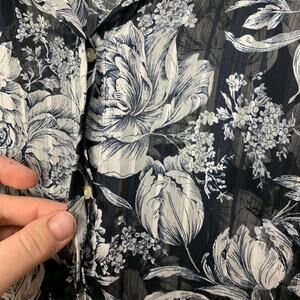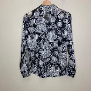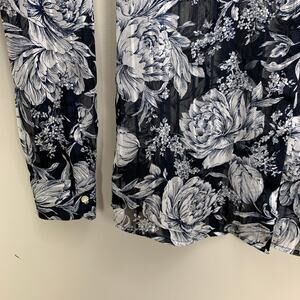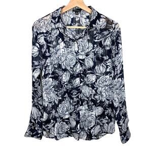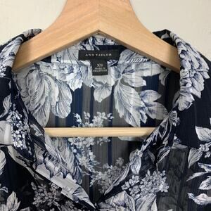 Ann Taylor Floral Button Down Blouse XS Extra Small Navy Blue White
