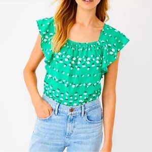 Ruffle sleeves put a romantic twist on this flattering woven top, cut with a shirred square neck. Shirred front and back square neck. Flutter sleeves. Shirttail hem.