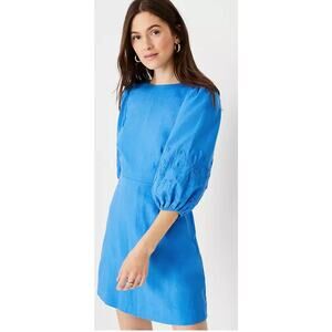 Ann Taylor Floral Embroidered Linen Blend Flare Dress Blue Stretch Classy 0P