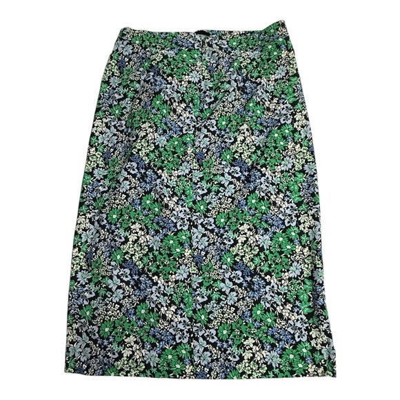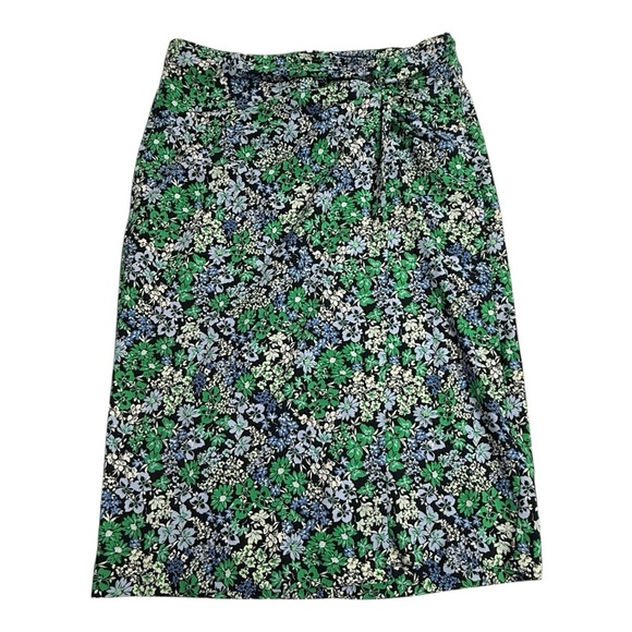 Ann Taylor floral print midi a-line skirt. Size 6. Back zip with hook and eye closure. Permanent wrap around style. Gathered at the waist. Blue/green/black/white floral print. Machine washable. Excellent condition.