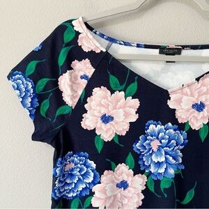 Ann Taylor Floral Rose Print Short Sleeve V-Neck Tee Shirt Navy Blue Size Small