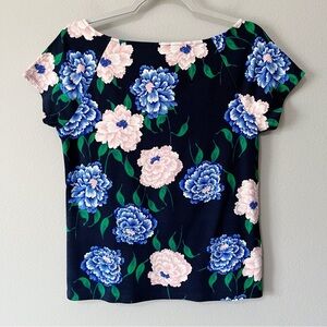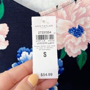 Brand new with tags Ann Taylor short sleeve tee shirt in navy blue (almost black) with pink and blue rose floral print. V-neck. Size small. Retailed for $54.99. NEW- writing on interior care tag.