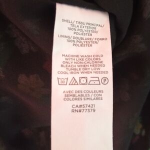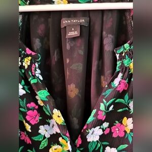 This is a beautiful Ann Taylor blouse in size S, in excellent used condition (EUC). It features a black background with a vibrant floral print in shades of pink, yellow, white, and green. The lightweight, flowy fabric gives it a feminine and elegant look, perfect for both casual and dressy occasions. The blouse has long, slightly sheer sleeves with elastic cuffs and a flattering V-neckline with delicate gathering at the shoulders.