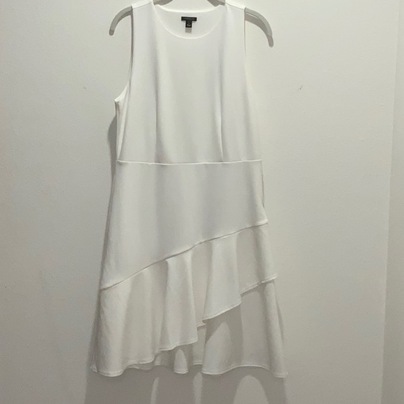 Ann Taylor sleeveless dress with diagonally seamed flounce hem in Winter White. Size 8. Excellent condition, worn once. No stains, holes, or other signs of wear. Side zip.