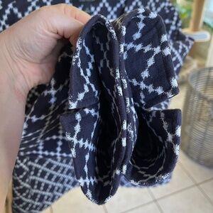 Ann Taylor full zip jacket blazer in a navy blue and white geometric pattern in a size 10. 3/4 sleeves with two front pockets. Jacket is unlined. See images for details and condition. Ask any questions prior to purchase.